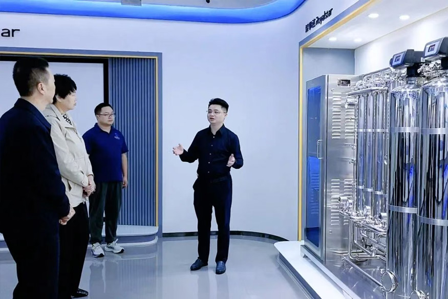 領(lǐng)導(dǎo)一行參觀公司全屋智慧凈水、管道直飲水、校園智慧飲水、單位/工廠直飲水等項(xiàng)目,了解公司在凈水行業(yè)全領(lǐng)域的發(fā)展情況。